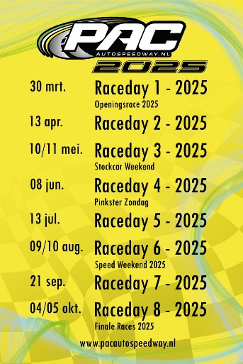 Aanvragen Jaarlicentie kan Via info@pacautospeedway.nl o.v.v. Naam rijder, Klassen, Startnummer, tevens in de mail persoonlijke informatie toevoegen plus recente kopie pasfoto. Kosten voor de jaarlicentie zijn net als in 2024 € 225,- invl. vrije trainingen en moeten worden overgemaakt via bank op Rabobank : NL36RABO 0142 3114 05 ovv. Naam, Klassen en startnummer.